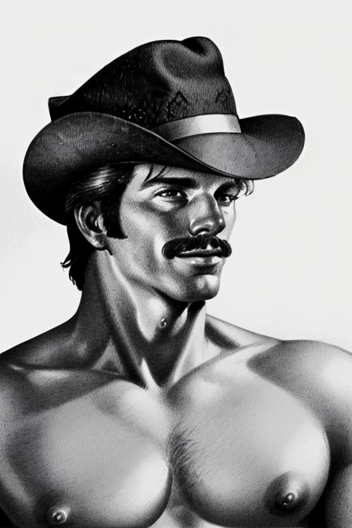 <lora:TomFin:0.8> t0f, pencil drawing of a man, stache, cowboy hat, shirtless, portrait, bad quality, low contrast, monochrome