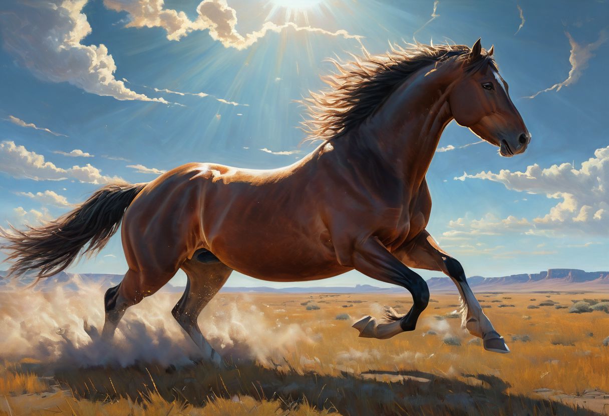 Realistic painting of a large horse galloping powerfully across a vast steppe, with dynamic ray tracing capturing the sunlight filtering through an expansive sky, by artists inspired by the detail and lifelikeness of George Stubbs and the dynamic compositions of Frederic Remington, cinematic composition, trending on ArtStation BadDream, anzhcdreamwave, aesthetic, glowneon, glowing, sparks, lightning