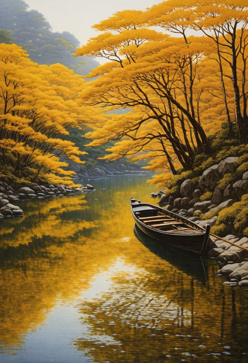 by Hasui Kawase, (golden but extremely beautiful:1.4), (intricate details, masterpiece, best quality:1.4), looking at viewer, wide angle view, <lora:add-detail-xl:1> in the style of nicola samori
