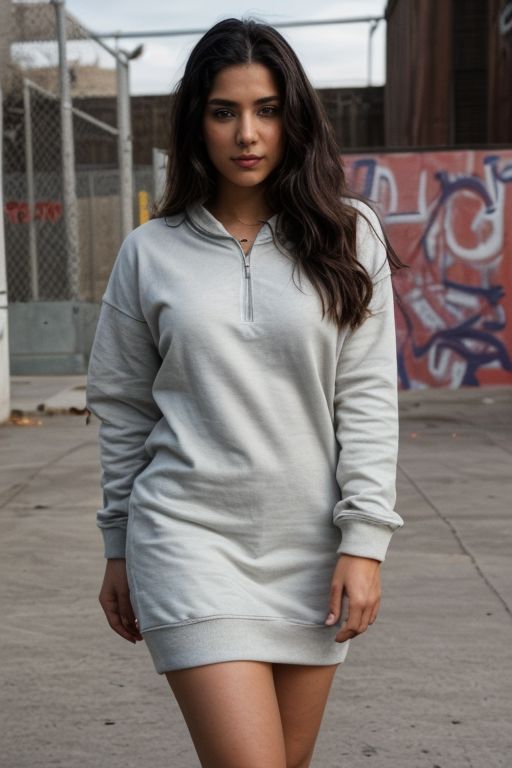 one pretty indian girl, supermodel, black hair, long hair, makeup, big tits, hanging breasts, nipples, oversized sweatshirt dress, unzip clothes, looking at viewer, posing, 80s style Skate Park, adorned with graffiti, soft lighting, film grain, cowboy shot, epiCPhoto, <lora:pytorch_lora_weights:0.5>, <lora:breastsizeslideroffset:0.2>, <lora:nagachichiD:0.6>, <lora:picxer_real:0.7>, <lora:InstantPhotoX3:0.3>, <lora:more_details:0.6>