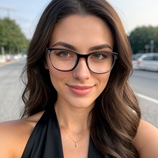 20 year old, European, petite, 100 lbs, woman, b cup breasts, classy, sexy, luxury, natural lighting, natural makeup, curled hair, dirty blond, clean background, love in her eyes, full body, light freckles, full body, slight smile, nerdy, glasses, zoomed out, black halter neck dress