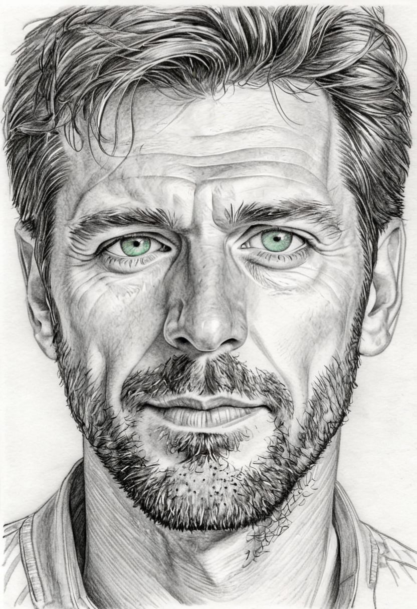 pencil sketch, man, male, AndrwTggrt, face shot, 42 years old, looking at viewer, handsome, beautiful, attractive, green eyes, brown hair