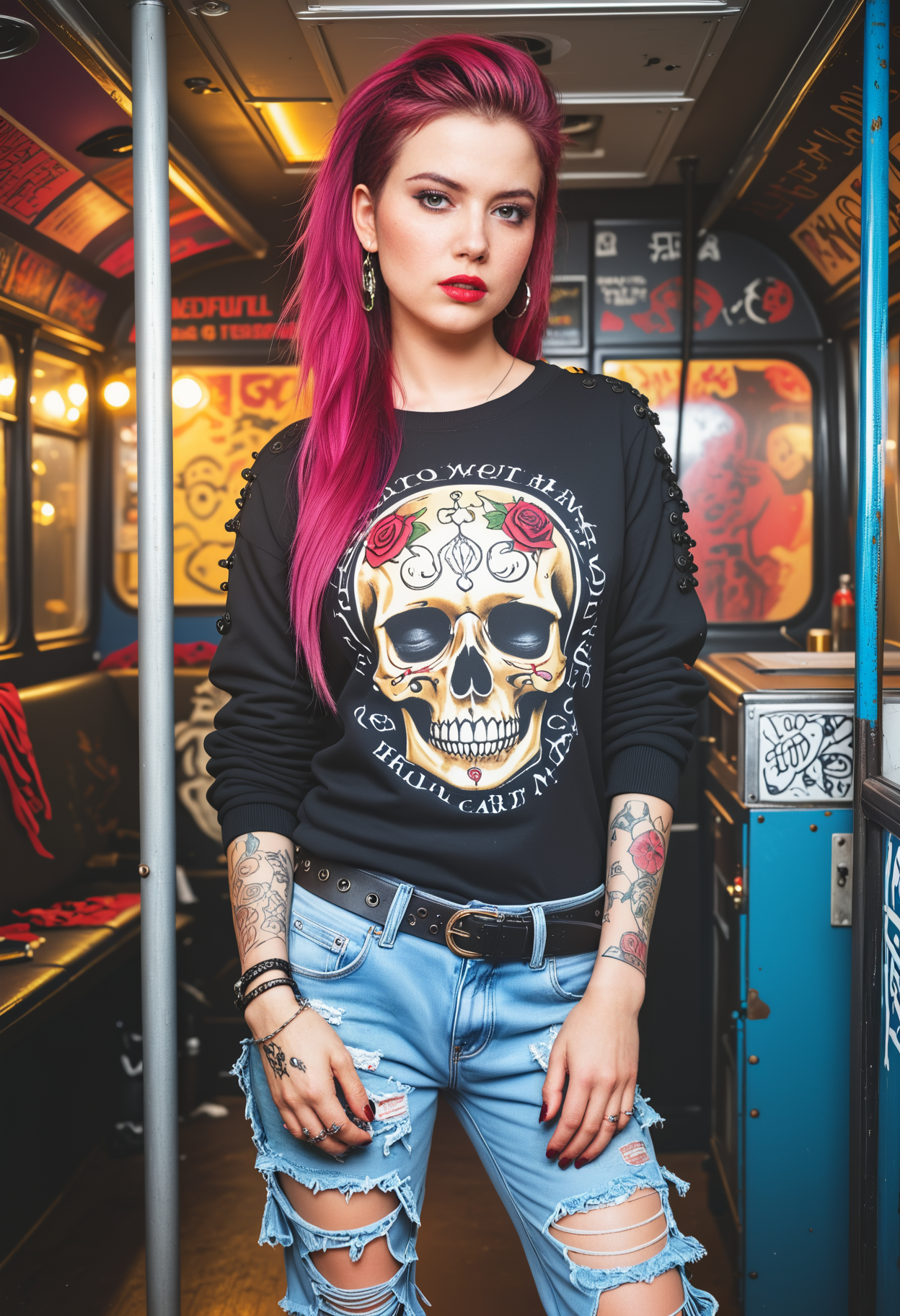 neonpunk style ((Full-Body Shot)), beautiful woman, masterpiece, best quality, (gorgeous young woman:1.1) punk russian, blue eyes, fair skin, tall,, wearing a distressed knit sweater with shredded sleeves,vinyl pants,platform sneakers, deep crimson red hair, fringe hair with shave sides, labret piercing, dark lipstick,mesh arm sleeves,heavily tattooed arms,adorned with safety pins and tiny skulls, in a punk-themed bus, converted from an old school bus and adorned with graffiti, band posters, and anarchic slogans, Passengers step aboard to find themselves immersed in a rebellious atmosphere, with punk music blaring from speakers and the interior decked out in DIY punk decor, at night, <lora:Noshi:.8> img . cyberpunk, vaporwave, neon, vibes, vibrant, stunningly beautiful, crisp, detailed, sleek, ultramodern, magenta highlights, dark purple shadows, high contrast, cinematic, ultra detailed, intricate, professional