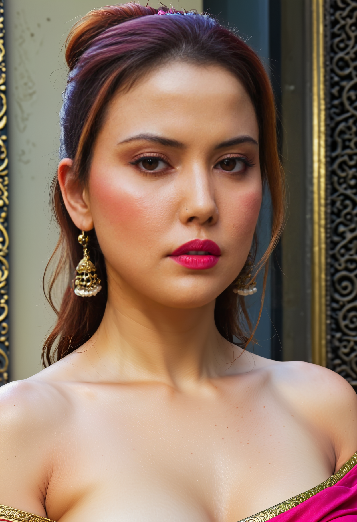 breathtaking ((Full-Body Shot)), masterpiece, best quality, Kusari Armor, Seductress, Tall, Lean, Square Face, Olive Skin, Red Hair, Amber Eyes, [[Curved Nose]], Pouty Lips, Round Chin, Shoulder-Length Hair, Coarse Hair, Messy Bun, soft breasts, Drop earrings, fuchsia, gloss lipstick, A dramatic sunset casting vibrant hues over a range of rugged mountains, <lora:Noshi:.8> img, <lora:perfection style:.7> perfection style, perfection, perfect . award-winning, professional, highly detailed