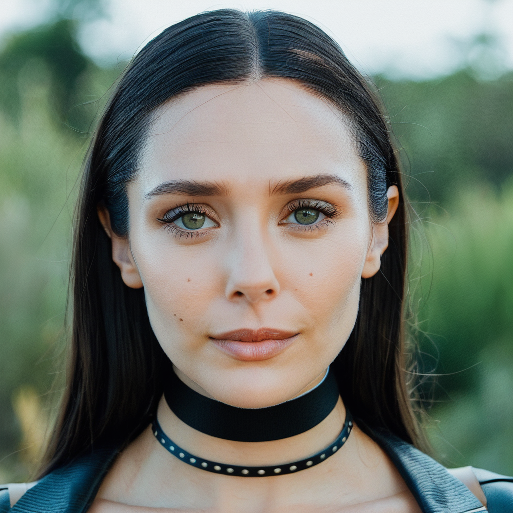 Skin texture, no makeup, Super high res closeup portrait photo of a woman outdoors with straight hair, wearing a choker around her neck,f /2.8, Canon, 85mm,cinematic, high quality,looking at the viewer, elixolsen, <lora:eliolsen_juggerX_v7_standard_wocap_merger_27_74_98_02_03_05-elixolsen:1>