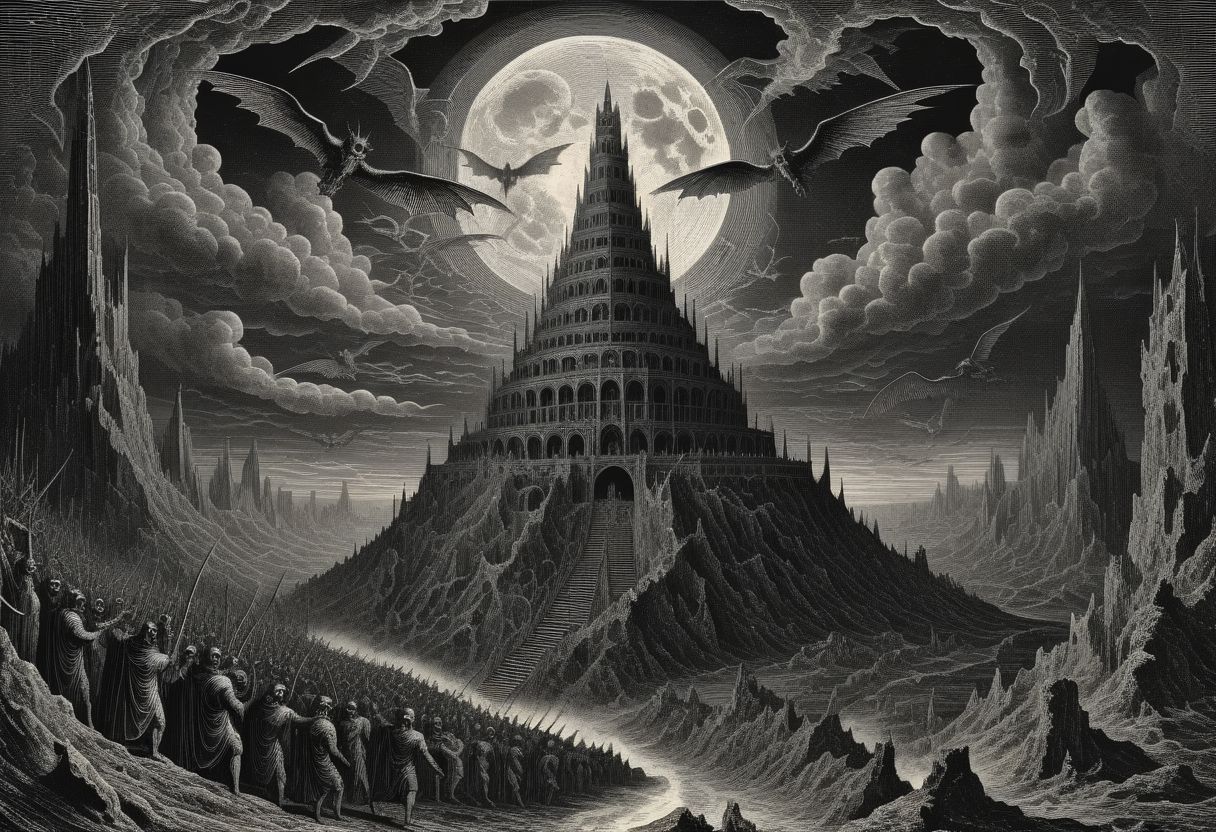 Gustave Dor Style page, woodcut illustration, masterpiece, ASCII, 8k, absurdes, intricate, maximum resolution, Dante s inferno legendary hell landscape, skulls as mountains, hell creatures and demons flying in the sky, Babylon tower in the center, full moon, lightning