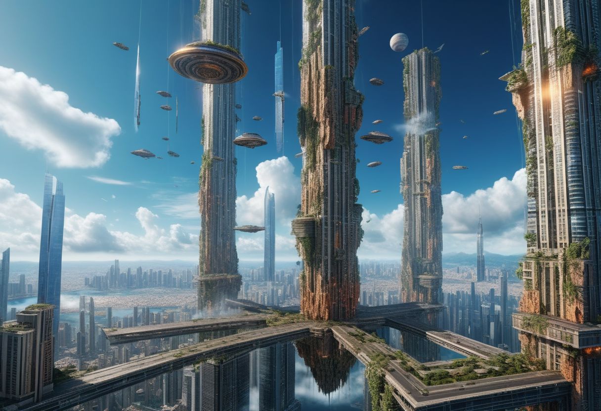 masterpiece, 8k, vivid color, high quality, ultra detail, ultra realistic, exquisite detail, a large floating city suspended in the air by a large pillar in its center, km high, hundreds of skyscrapers, suspended in space, crashed sky, cinematographic lighting, volumetric lighting, hdr, ssao,