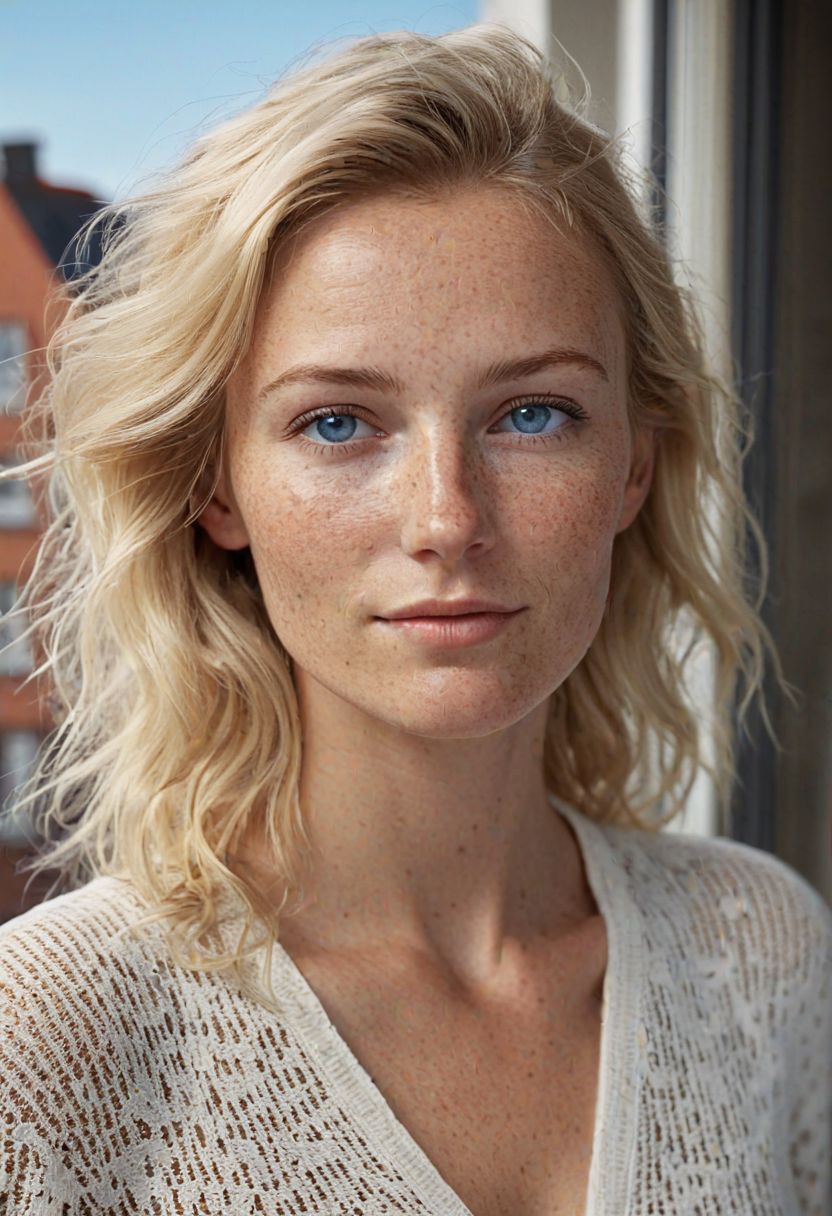 Stunning photo of my 35 year old Danish girlfriend, full body, very pretty, fit, skinny, highly detailed face, highly detailed skin, freckles, many freckles on arms and tits, freckles and moles all over body, natural breasts, perfect breasts, hard nipples, Rounded ass, white blonde hair, pubic hair, messy hair, medium hair, blue eyes, on balcony of her apartment in Kopenhagen, natural light, in love, very detailed skin, highly detailed face, ultra realistic, extremely detailed Unreal engine 5, 8k resolution, ultra photorealistic