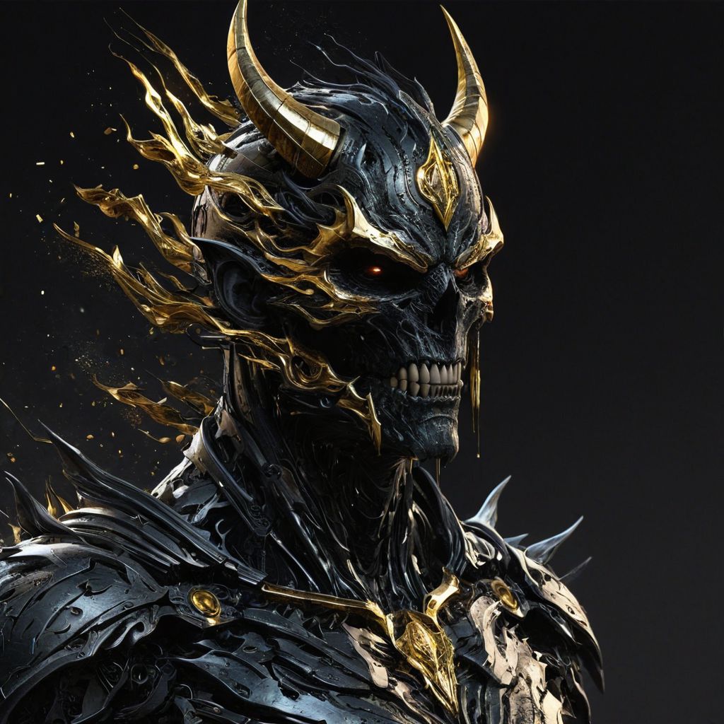 create an CGI animated cartoon Godspeed art style , a corrupted male A.I avatar, make the design holographic , give it a demonic a black appearance, with sharp teeth ) but make fall in line with the demon lord archtype, with tattered apperance , as well as the sin of pride , , make it look like it's made of corrupted data give it glitched out appearance, have it look it's made of corrupted data, a black appearance , with gold accent, and gold 1's and zeros , gold era ,think a digital eldritch and gold apperance abomination