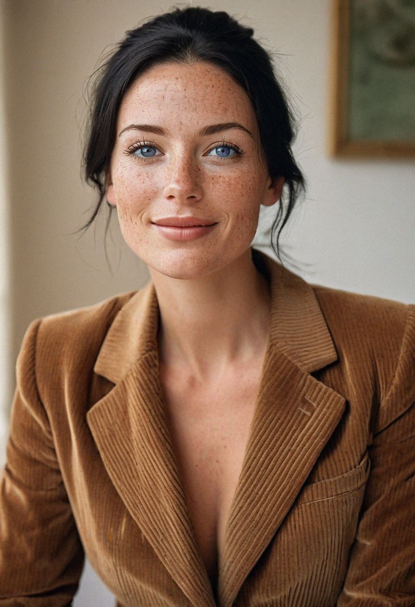 Stunning analogue photo of a beautiful 38 years old Dutch woman, corduroy suit, corduroy pants, perfect face, absolute beauty, sexy pose, natural raven black hair, ponytail, blue eyes, perfect eyes, realistic eyes, freckles, freckles and moles all over body, realistic freckles, absolute perfect tits, big tits, nice and soft natural tits, absolute perfect nipples, looking up, laughing, in her cozy bedroom, vintage style, natural warm and soft light, early morning, stunning result, highly detailed skin, highly detailed eyes, highly realistic