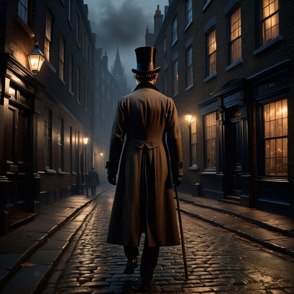 Ultra realistic full body color pencil drawn portrait of a man seen from behind, with a top hat, a cane and a a long coat, walking through a street of 1850 London, at night. Vibes of Charles Dickens. BREAK Deep dark intense brown foggy background, Dark theme, dynamic lighting, (soft shadows), (soft focus), (photo realistic), uhd, 8k