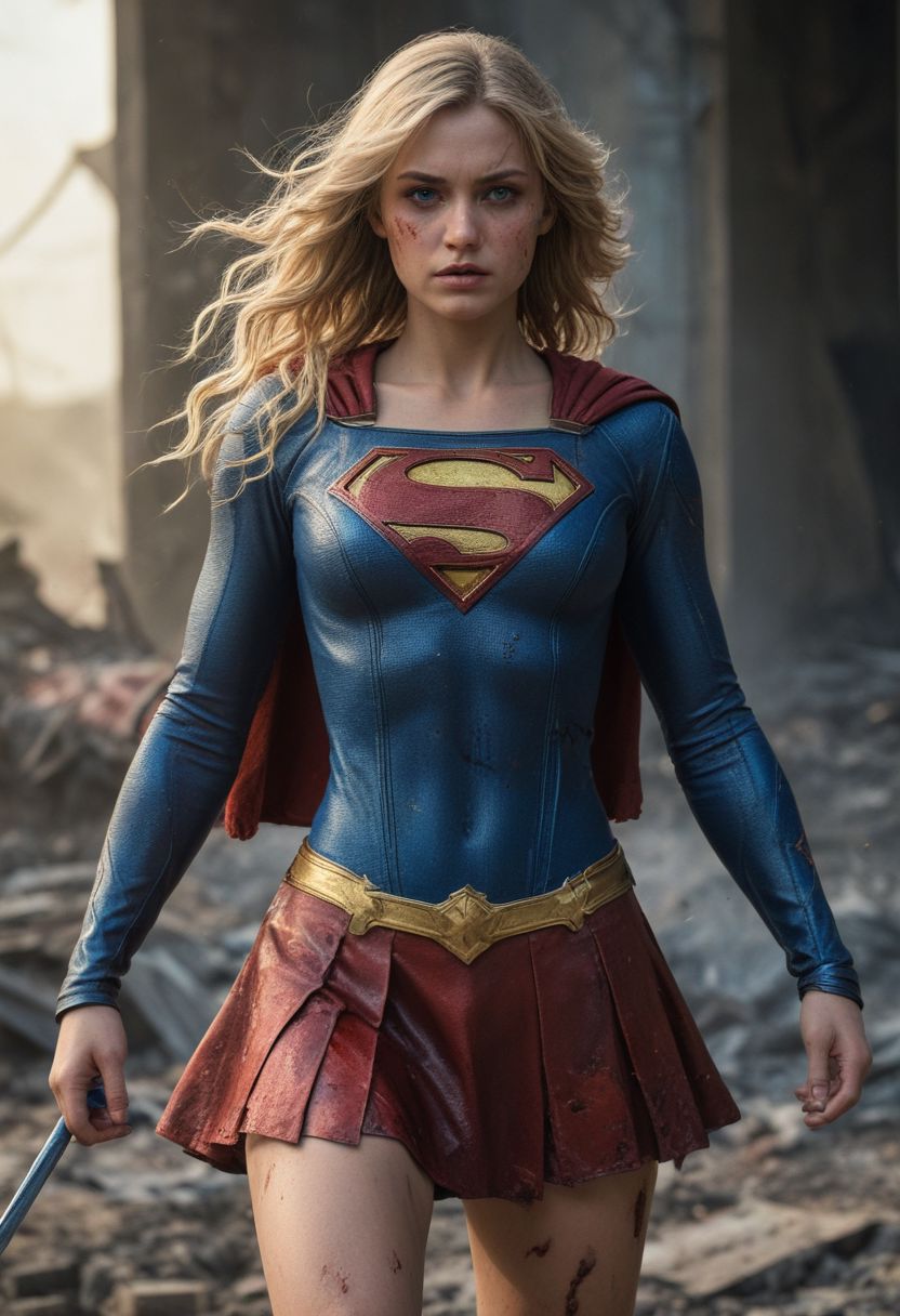 High resolution ultra-realistic of beautiful Supergirl with wavy blonde hair, Greg Rutkowski, Intricately Designed Handsome dirty bloody face, Realistic beautiful blue eyes, Atrractive 21 years old woman, clad in intricate dirty torn combat costume, red mini skirt, blood-smeared, DC Comics elements, Standing on the battlefield in the bloody carnage, burning ruins of buildings, fighting pose, full body, Intricately Designed combat costume, 8K, ultra-realistic body, Beautiful Warrior Supergirl with wavy blonde hair, realistic dirty and bloody face, realistic beautiful blue eyes, defiant and seductive, covered in dirt and blood, Cinematic Lighting, sharp focus, digital painting, Photograph Taken on Nikon D750, Alphonse Mucha, 8K, athletic figure, Hyperdetailed, hyperrealism