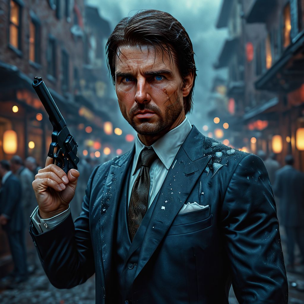 Ultra realistic full body color pencil drawn portrait of Tom Cruise in Pulp Fiction as a hired gunman. BREAK Deep dark intense midnight blue misty and starry background, Dark theme, dynamic lighting, (soft shadows), (soft focus), (photo realistic), uhd, 8k