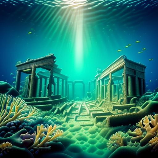 ((((hiperrealistic)))), ((((high quality)))), ((((underwater)))), ocean monument, (((ruined underwater city))), fishes, ((fish bank)), ((coral reef)), ((glowing beneath the waves)), UnSea