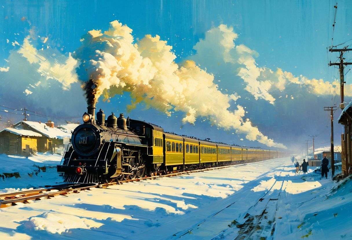 ((masterpiece, best quality, high quality, high resolution, ultra-detailed)), ,moving train through the snow<lora:soldart:0.6> <lora:AngelicAI:0.1> <lora:add_detail:1>,, with a moving train in the background, blue sky, sunny day, epic clouds, (oil painting: 0.1), (best quality, 8K, high resolution, exceptional detail, outstanding composition: 1.4), art by Jeremy Mann, divine rays, dramatic light, (rich oxygenated air and protected atmosphere, aesthetics of hard painting: 0.1),