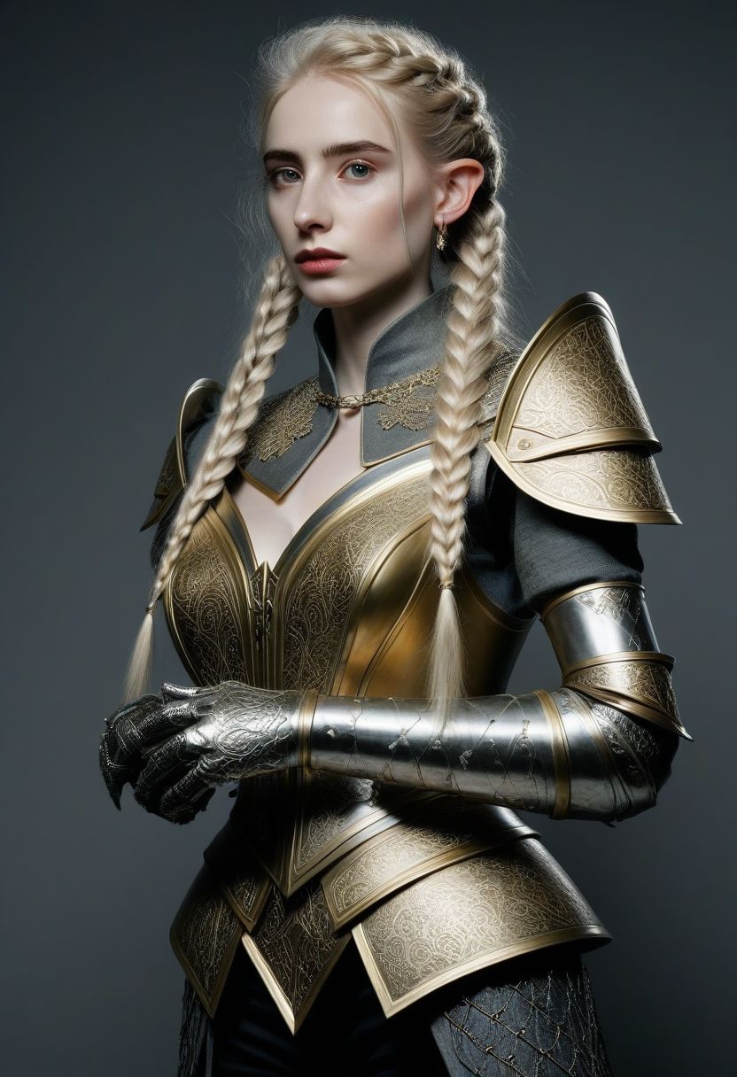 1girl 18 yeas, elf, slender, pale skin, goosebumps, very long gold and silver hair, triple braids, light grey eyes, (small pointed ears:1.3), Milanese plate armor, black gauntlets, dnd character portrait, intricate, analog photograph, masterpiece, expertly crafted, incredibly detailed, 8k resolution, (By Alice Pasquini, by Aliza Razell:0.8), low angle shot, Cinematic Hollywood Film style a young woman, 18, sensually dynamic pose ,
