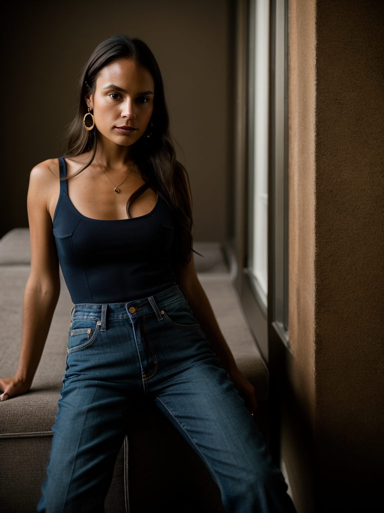 Realistic photo of a beautiful j0rd4n4b woman, 1girl, solo, long hair, breasts, brown hair, black hair, brown eyes, jewelry, earrings, pants, bracelet, sandals, denim, jeans, toeless footwear, soft lighting, professional Photography, Photorealistic, detailed, RAW, analog, sharp focus, 8k, HD, DSLR, high quality, Fujifilm XT3, film grain, award winning, masterpiece<lora:j0rd4n4b:1.0>
