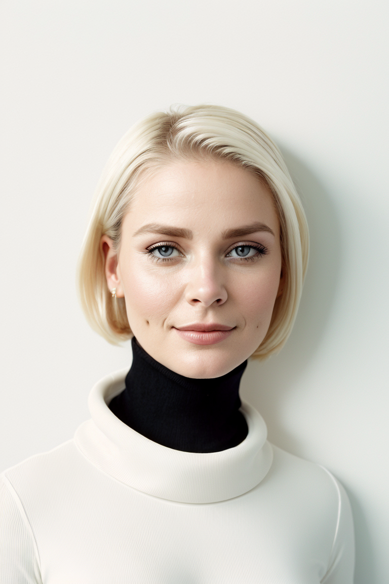face portrait photography of european female, close up, (facing viewer:1.5), cheeky smile, blonde hair, (31 years old:1.2), (black turtleneck:1.3), goosebumps,goose-flesh, (realistic:1.3), finely detailed, quality, (masterpiece:1.2), (photorealistic:1.2), (best quality), (detailed skin:1.3), (intricate details), dramatic, ray tracing, photograph, Wind surfboard, Bathed in shadows, Visual novel,(studio white wall background:1.5), film grain, Kodak gold 200, Depth of field 100mm, Flickr