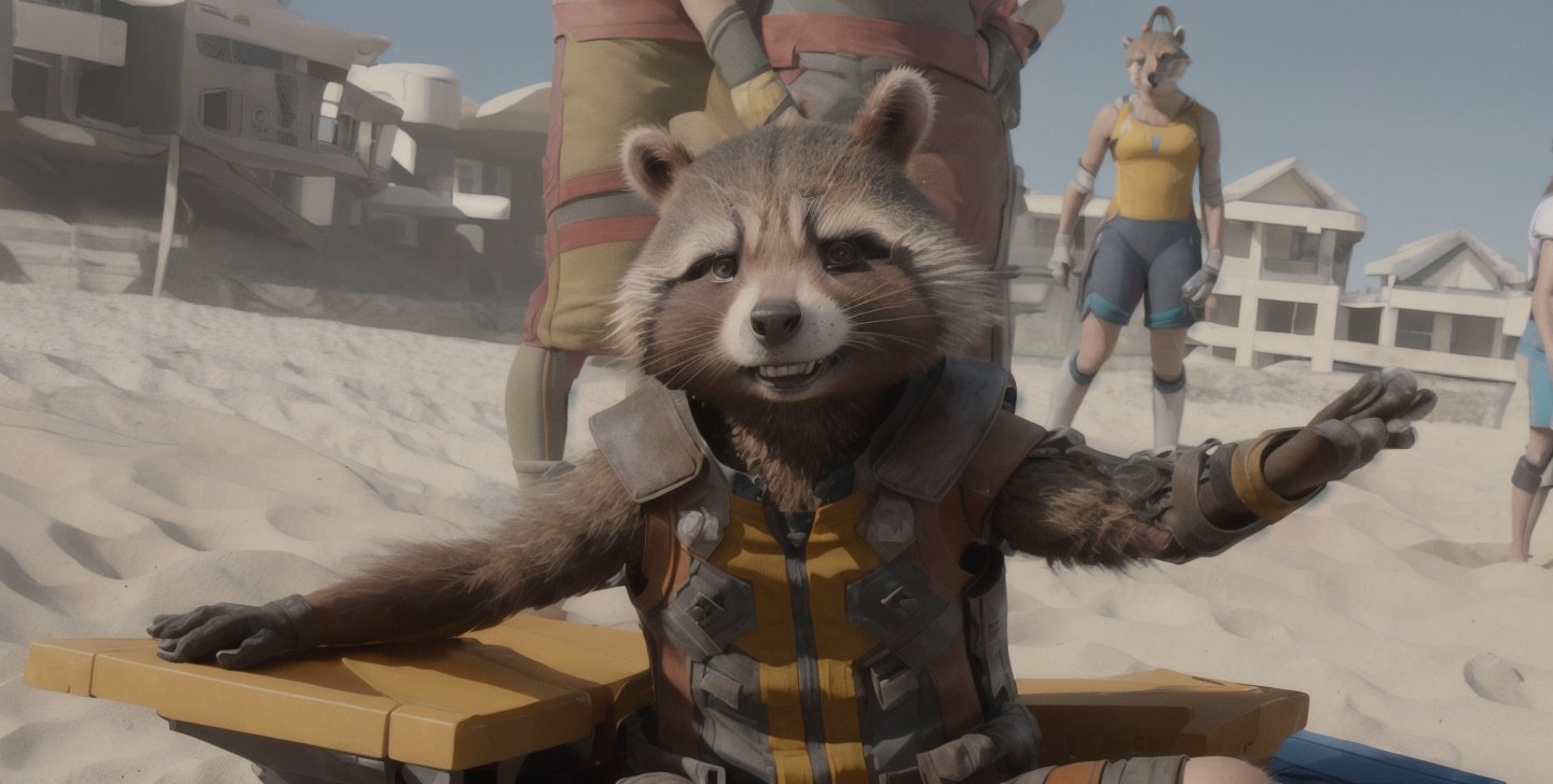 <lyco:rocket_v1.0:1> rocket playing volleyball at the beach