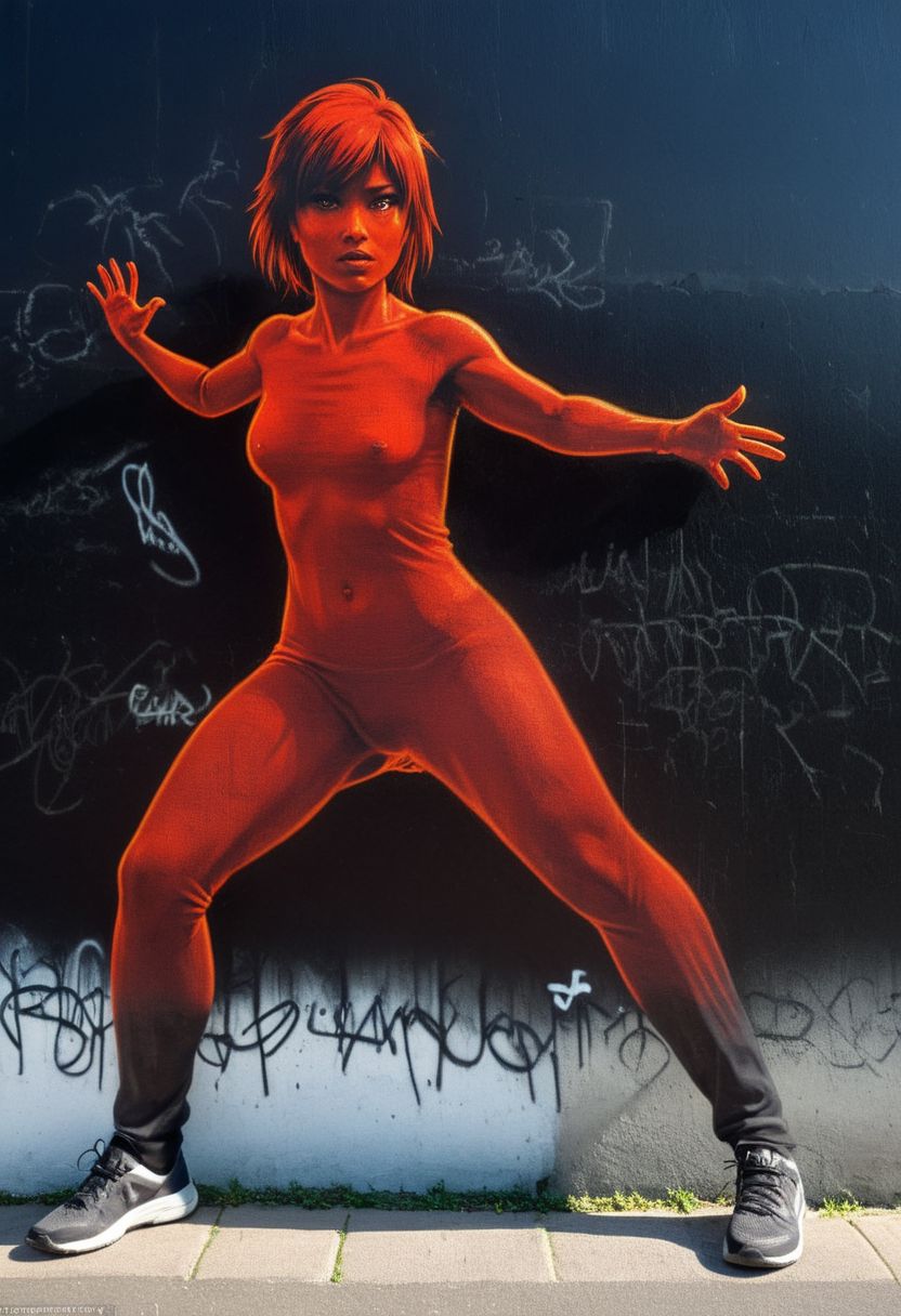 Closeup, amazing quality, masterpiece, best quality, hyper detailed, ultra detailed, UHD, perfect anatomy, portrait, dof, hyper-realism, majestic, awesome, inspiring,, Walking along a street and looking at a plaster during the walk, lenticular effect Poster, 3d Illusion, a feudal shinobi fight stance, high kick, in front of an old weathered concrete wall lighted from within sss vibrant translucent red-black tones sharp anime style graffiti, The graffiti depicts a martial arts feudal knightess runs afterwards as she passes by., high kick Sideview of the Wall, dutch Angle, one Leg kicking Out of the Wall, surreal, infront of a weathered black concrete wall with a Deep DARK depth effect lenticular in the Wall - Capture the essence of Wall art and 3d Illusion in this vibrant snapshot emphasis lines, horizontal perfect bold lines, perfect align lines,