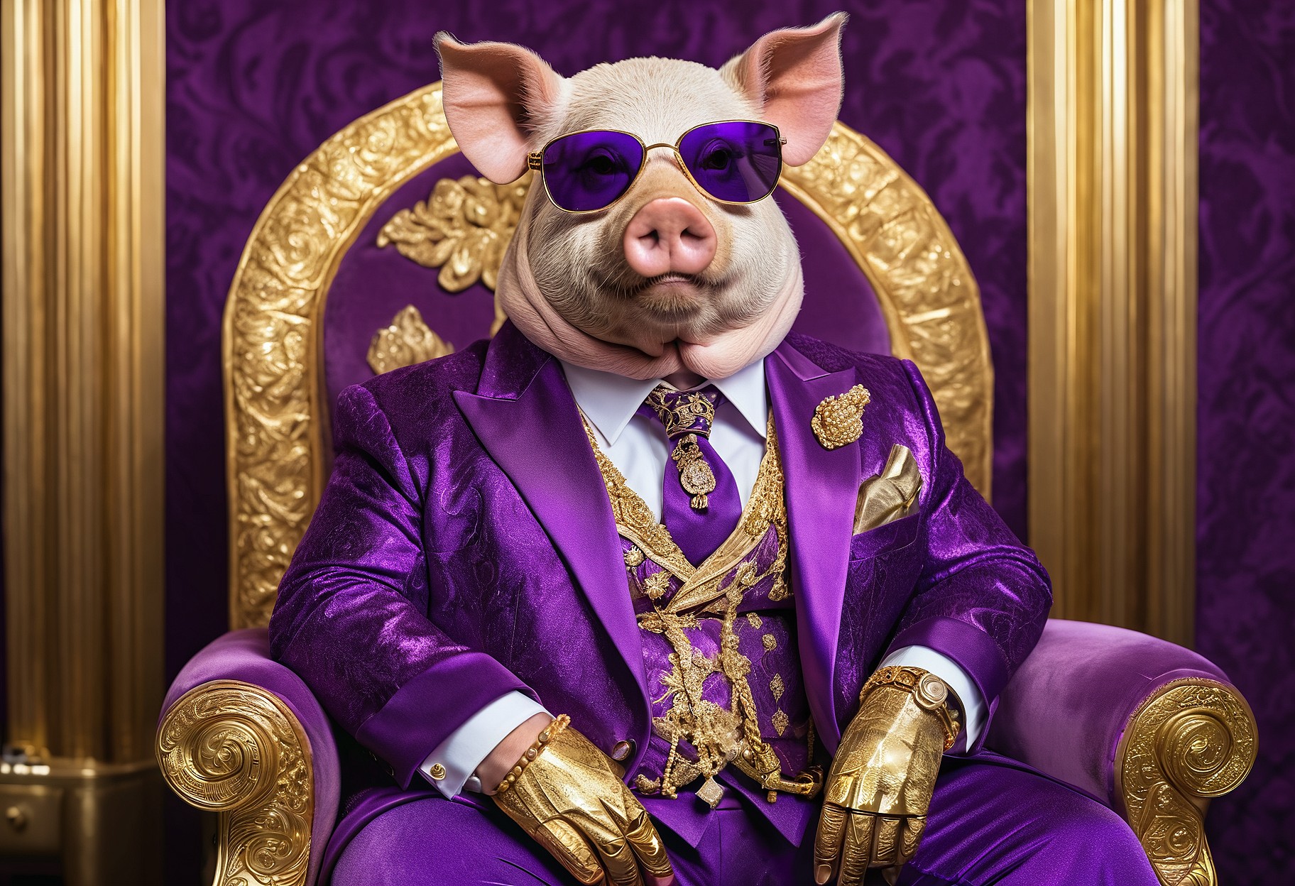 A humanoid | anthropomorphic pig dressed in a fancy suit, flaunting its wealth | Gold chains, fur on the shoulders | gold glasses | Sitting on a purple velvet throne at a mafia party