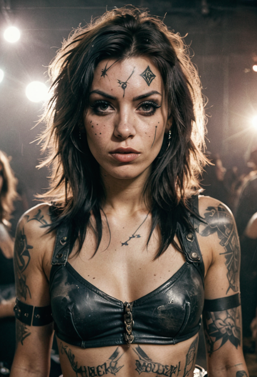 realism, epic world, brutal rocker chick with tattoo, rock party, faded film, desaturated, award winner art, artstation, 35mm photo, grainy, vignette, vintage, lomography, stained, highly detailed, found footage, highly detailed, volumetric, dramatic lighting, <lora:detailed_hands:0.6> <lora:Old_Photo_XL_V1:0.4>