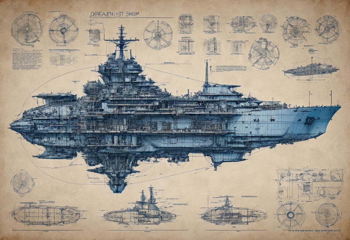 construction plan with blue thin lines for a huge dreadnought ship with 6 floors sketch style high def,ship cut in half with instructions and descrption of each parts