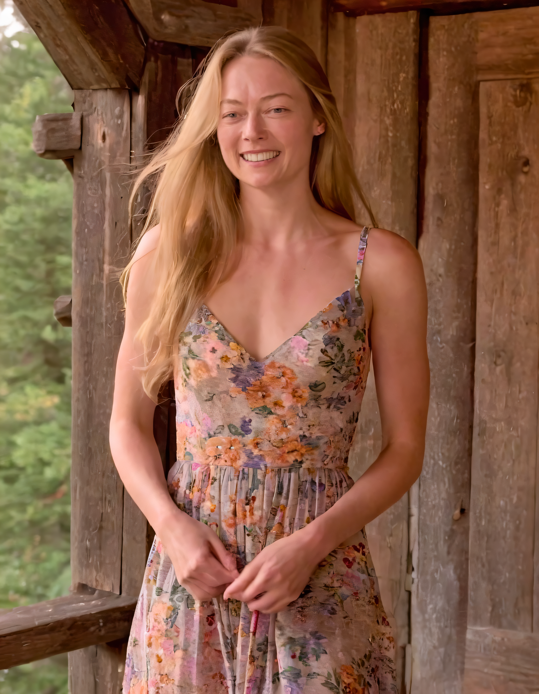 Hannahlee Duggan, with her long flowing golden locks and an ethereal smile, captivated the room as she effortlessly stepped into a breathtakingly scenic backdrop of rustic architecture while wearing a stunning, floral printed dress that effortlessly accentuated her graceful movements, making the enchanting atmosphere at this picturesque location even more memorable. hannahleeduggan <lora:htoprl18ec2ac5fd5t36:1>