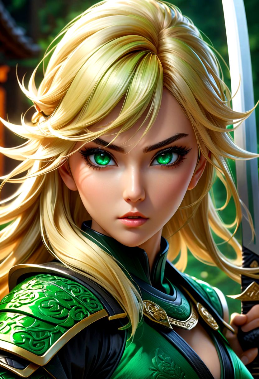 masterpiece,HDR,trending on artstation,sharp focus,high contrast,8K,Hyper-detailed,intricate details,cinematic lighting, <lora:add-detail-xl:1> perfect eyes, crystal clear eyes, nsfw, hyper maximalist , green theme, blonde hair, image presents a stylized ninja, characterized by vibrant and abstract splashes of emerald green. the main figure, the ninja, is depicted in a dynamic pose, holding a sword, which suggests action or combat. the background features bold and expressive brush strokes that create an energetic atmosphere. the colors used are vivid and varied, with multiple shades and hues creating a lively visual experience. overall, the style can be described as modern and artistic, with a strong emphasis on movement and energy.