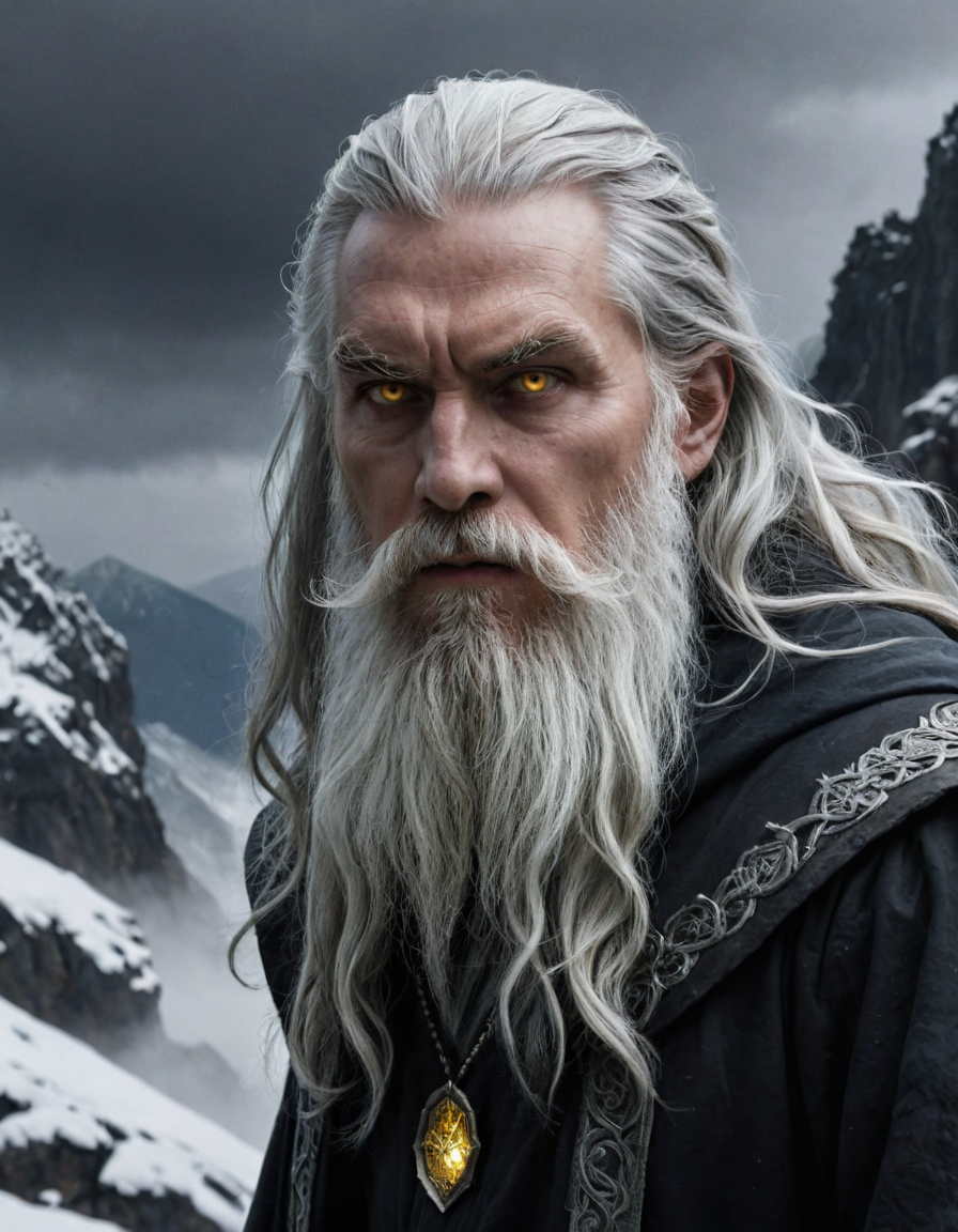 an award-winning digital art piece featuring a menacing and powerful wizard. This bearded figure, with long hair and stark white facial hair, is highlighted by a dim backlight creating a stark contrast against a dark, foggy atmosphere. His yellow eyes pierce through the ominous scene set on a snowy mountain top. Rendered in a realistic fantasy style with a monochromatic palette of blacks, grays, and whites. This work would stand out in Fantasy Art Online Galleries, Dark Fantasy magazines, and captivate at the Spectrum Fantastic Art Awards or World Science Fiction Convention Awards. Featured in Fantasy Magazine and ImagineFX.