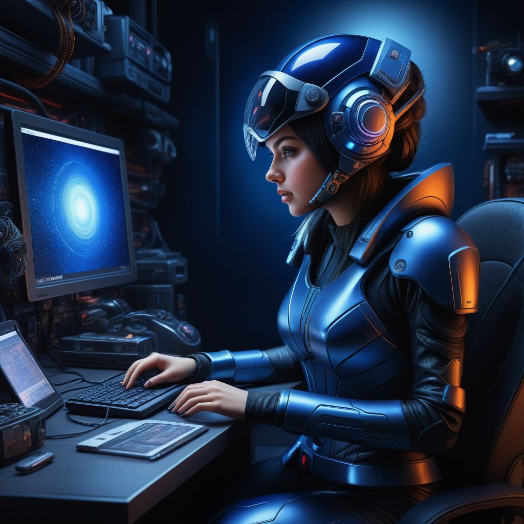 Ultra realistic color pencil drawing of a cyber scavenger woman, trying to sell gadgets that she have collected. Wearing scrappy clothes on a desert planet. BREAK Deep dark intense midnight blue misty background, Dark theme, dynamic lighting, (soft shadows), (soft focus), (photo realistic), extreme details, uhd, 8k