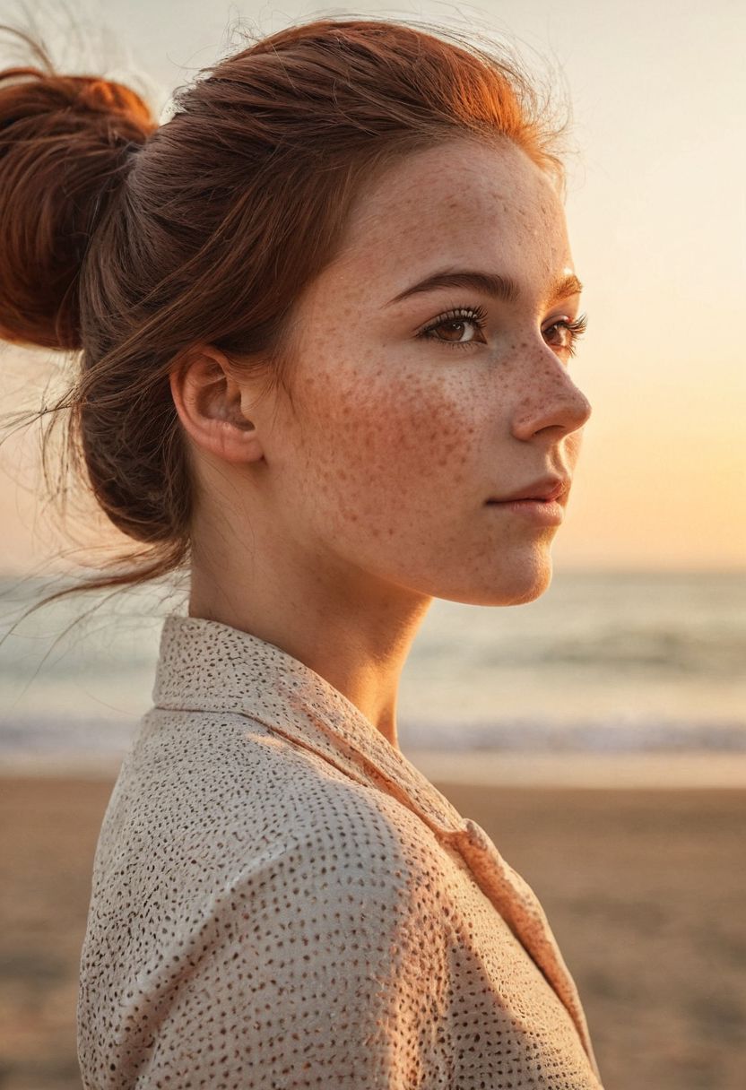 A beautiful photo of a beautiful 20 years old Dutch woman, full body, sideview, incredibly pretty narrow nose, fit, highly detailed face, highly detailed skin, freckles, brown hair, red hair, big hair, medium hair, 70's style hair, ponytail, brown eyes, perfect eyes, detailed eyes, detailed pupils, happy, slightly smiling, black bikini, on the beach, soft light of the sunset, soft natural light, hyperrealism, sharp focus, (masterpiece, best quality, ultra high res:1.2), (photo-realistic:1.3)