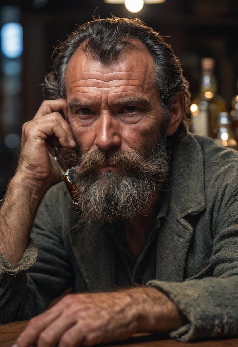 Moebius (Jean Giraud) Style page, a portrait of a seaman with a rugged, thick beard, capturing a slightly befuddled expression, he is sitting at the table next to him there is a bottle of whiskey, focus is on his facial expressions and the subtle details like the texture of his beard and the glint in his eyes, cozy, slate gray atmosphere, soft cinematic light, RAW photo, dreamy soft focus, detailed photo, gorgeous, shallow depth of field, bokeh, volumetric lighting, iridescent skin, (surreal:0.4), hyper detailed photorealistic life-like accurate proportional 8k sharp focus, (accurate cinematic lighting), photorealistic detail