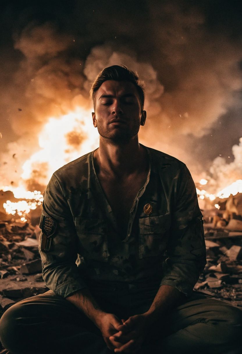 dim light, extremely blurry disposable photo, RAW photo, portrait of a young man meditating calmly among war, chaos and explosions, cinematic lighting, heavy film grain, shallow depth of field