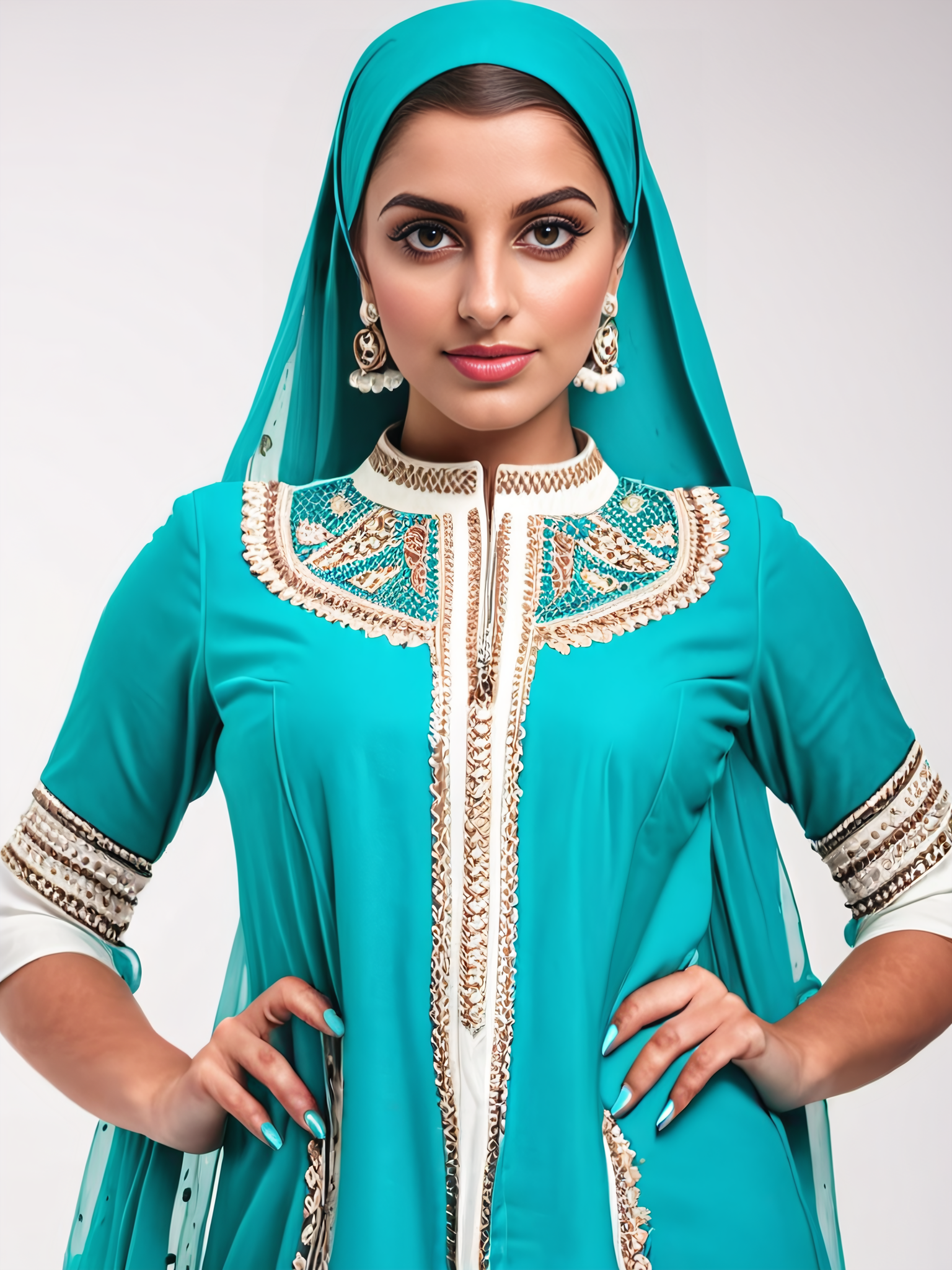 highres photo of 25 year old beautiful desi woman, (plain white background: 1.6), turqoise ethnic Punjabi Suit with head scarf, fashion photography, dynamic pose, facing viewer, <lora:Desi_Coffee_V30_SDXL_LoRA:1>