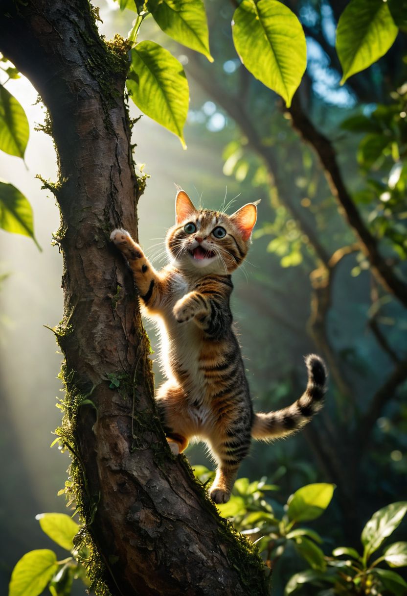amazing quality, masterpiece, best quality, hyper detailed, ultra detailed, UHD, perfect anatomy, dof, awesome, inspiring, Expressiveh, realistic, high quality, 4K, absurd resolution, incredibly detailed, masterpiece, sharp, a beautiful small cat dancing on tree, amazon jungle, extremely detailed, no humans, extremely detailed scales, sunlight, realistic, high quality, detailed, shadows, glowing, bright colors, high contrast, vivd lighting, cinematic composition, soft shadows, national geographic style,