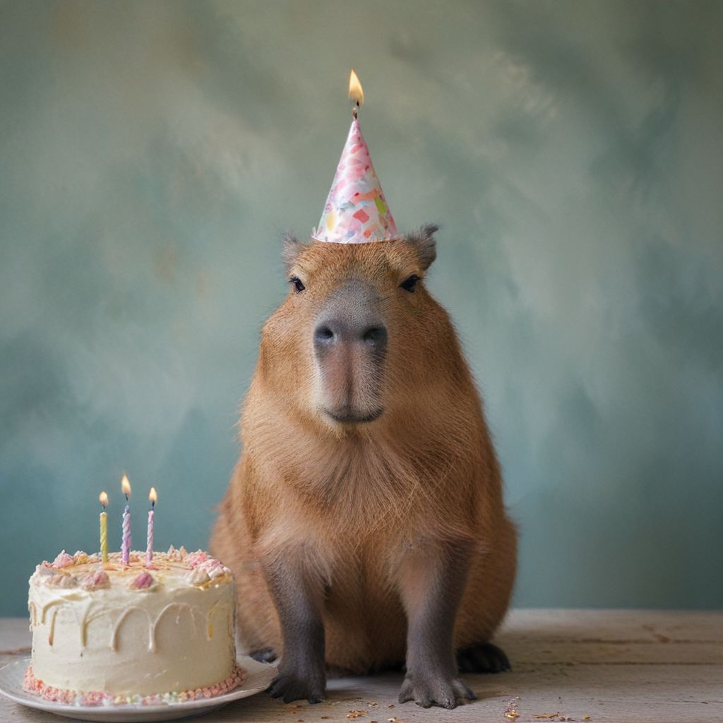 amazing quality, masterpiece, best quality, hyper detailed, ultra detailed, UHD, perfect anatomy, portrait, dof, hyper-realism, majestic, awesome, inspiring, Captured in the midst of a serene celebrating with a birthday cake, this adorable fluffy capybara basks in the tranquility of its natural habitat wearing a birthday hat. cinematic composition, looking to the side, soft shadows, national geographic style, colorful background