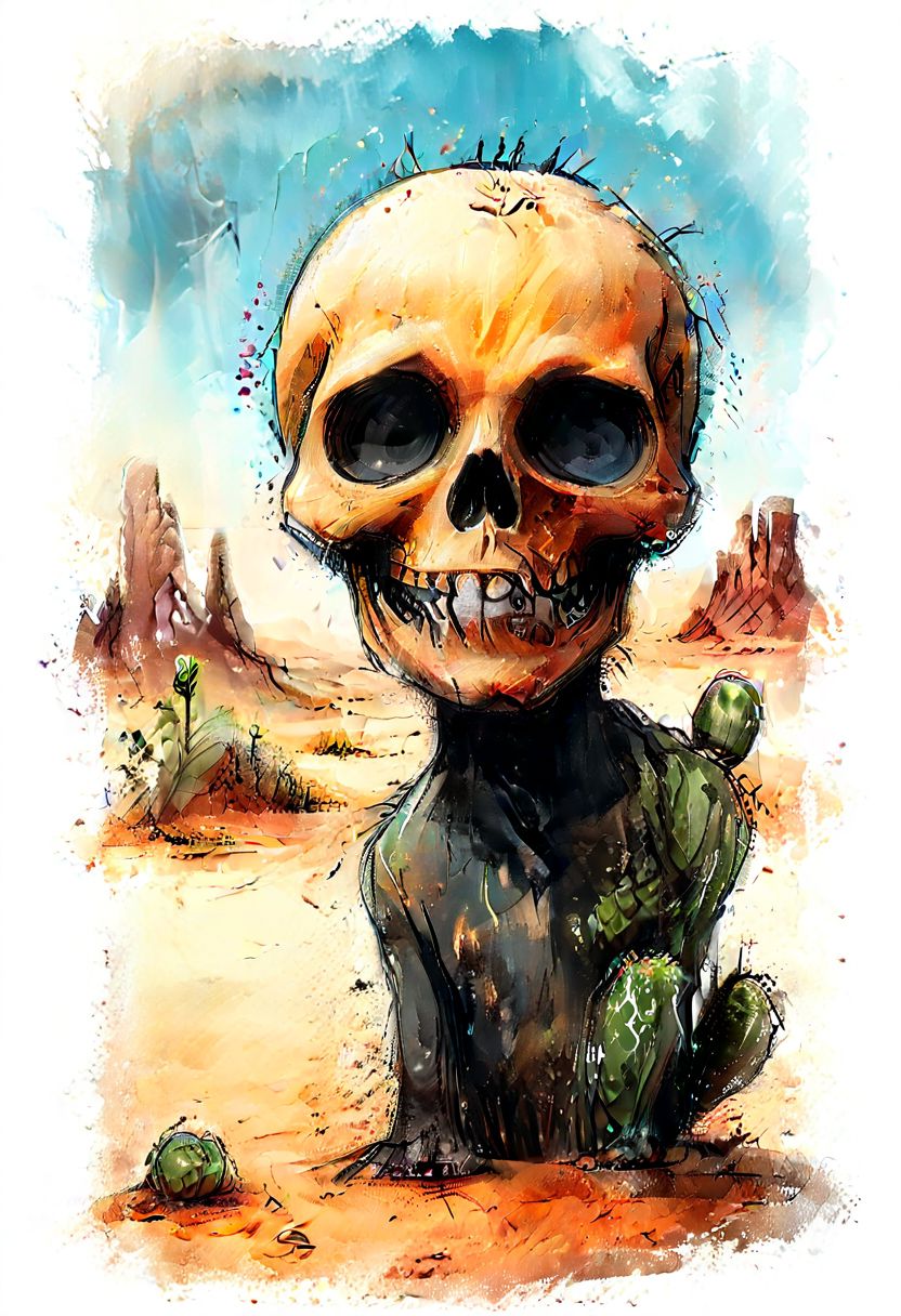 impactful color paint of cute drawing of a skull in desert, snake, cactus, highly detailed, 8k, sharp, professional, clear, high contrast, crystal clear