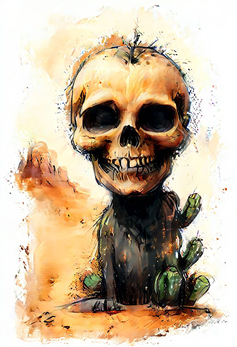impactful color paint of cute drawing of a skull in desert, snake, cactus, highly detailed, 8k, sharp, professional, clear, high contrast, crystal clear