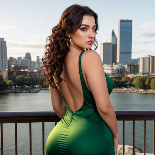 A breathtakingly beautiful and curvaceous twenty-year-old brunette with luscious green eyes, gazing straight into the camera. Her flawless, porcelain skin is bathed in warm, golden light, accentuating the soft, round curves of her voluptuous figure. She wears a plunging, crimson dress that hugs her hourglass figure, emphasizing her ample cleavage and toned arms. The dress flares out at the hem, swaying enticingly with each gentle step she takes. Her long, wavy brunette hair cascades down her back in a waterfall of dark curls, framing her exquisite face perfectly. A pair of dangling emerald earrings catches the light, reflecting the same vibrant green hue as her mesmerizing eyes. The backdrop is a blurred, indistinct image of a busy cityscape, serving as a stark contrast to the model's ethereal beauty and serene composure