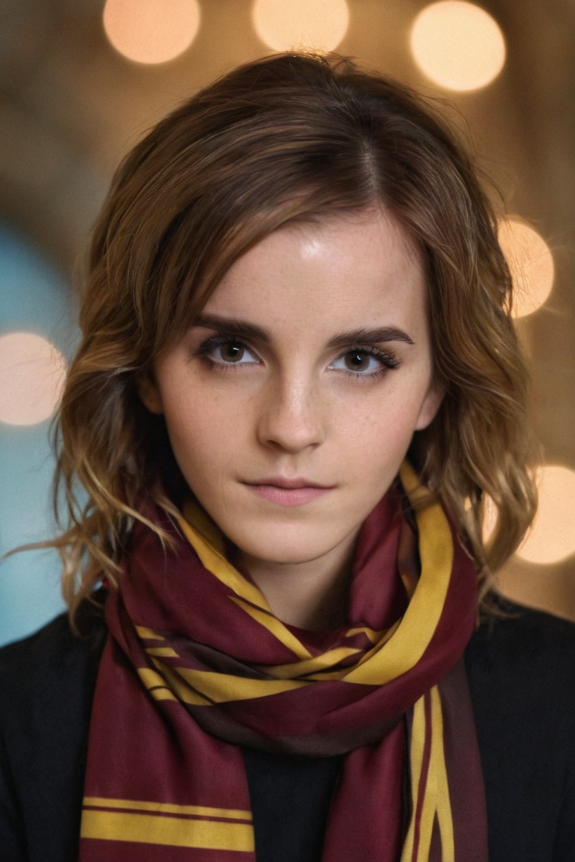 emma watson face partially obscured by a gryffindor scarf, highlighting her striking eyes. The focus is sharp on her eyes with a soft bokeh background that creates a shallow depth of field. Her hair frames her face, and the image has a cool color tone with a natural light setting. The composition is centered, creating an intimate and engaging portrait with a sense of mystery. <lora:emmaWatson:1> . 35mm photograph, film, bokeh, professional, shot by sarah moon, 4k, highly detailed