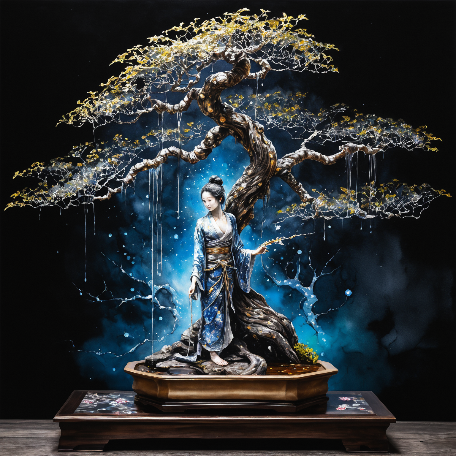 brocade cracked kintsugi artistic, wet watercolor painting of beautiful bonsai statue in the night, mesmerizing beauty, pretty features, iridescent, Luis Royo, Agnes Cecile, Ruan Jia, masterwork by head of prompt engineering
