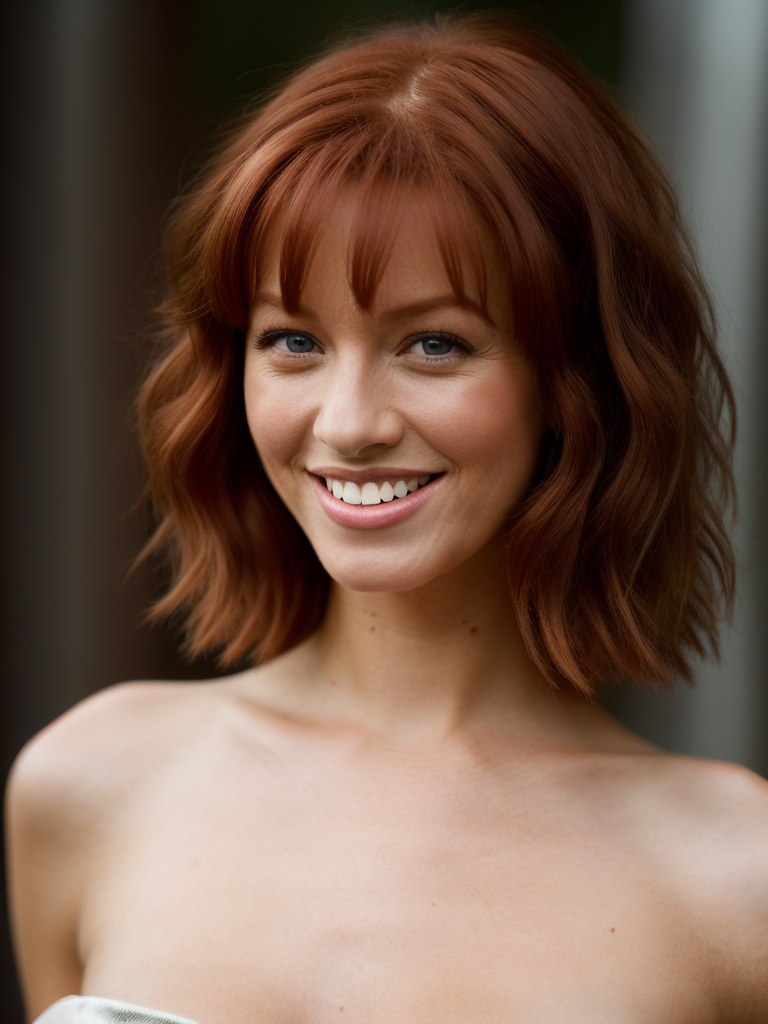 Realistic photo of a beautiful l1ndyb woman, 1girl, solo, looking at viewer, smile, short hair, blue eyes, red hair, dress, bare shoulders, teeth, grin, black dress, strapless, traditional media, strapless dress, realistic, soft lighting, professional Photography, Photorealistic, detailed, RAW, analog, sharp focus, 8k, HD, DSLR, high quality, Fujifilm XT3, film grain, award winning, masterpiece<lora:l1ndyb:1.0>