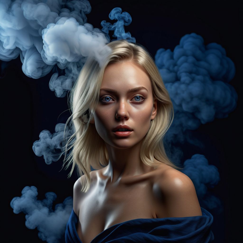 Ultra realistic color pencil drawn portrait of a beautiful 20yo blonde female photo model modeling in a studio on a black box against a midnight blue backdrop and with smoke machines filling the room with fog, giving her the appearance of emerging from the fog. BREAK Deep dark intense (midnight blue hazy background:1.6), dynamic lighting, (soft shadows), (soft focus), (photo realistic), uhd, 8k