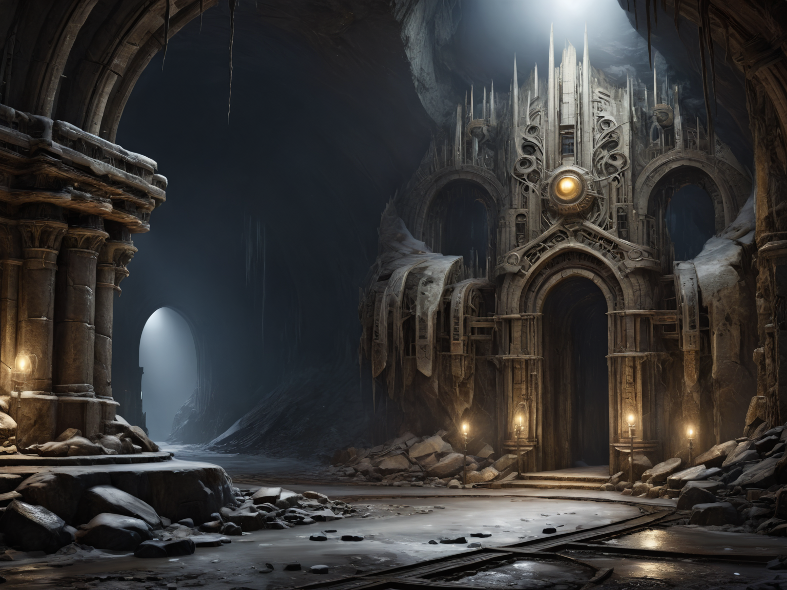 <lora:JJsUnderGroundBuilding_XL:1>, ((UnderGround Building)), ((masterpiece)), ((best quality)), scenery, real world location, realistic, dramatic lighting, high detailed, center composition, ,scenery, dramatic lighting, best quality, hyper detailed, ultra detailed, ultra high definition, 8k, super sharp focus, golden ratio, great detail of textures, night,sky, building, indoor lighting,road,ice, river, mountain, bridge, moon, blizzard, torch, snow, stone robot,