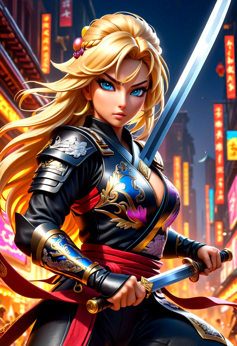 masterpiece,HDR,trending on artstation,sharp focus,high contrast,8K,Hyper-detailed,intricate details,cinematic lighting, <lora:add-detail-xl:1> perfect eyes, crystal clear eyes, nsfw, hyper maximalist , American theme, blonde hair, image presents a stylized ninja, characterized by vibrant and abstract splashes of hot dogs and eagles. the main figure, the ninja, is depicted in a dynamic pose, holding a sword, which suggests action or combat. the background features bold and expressive brush strokes that create an energetic atmosphere. the colors used are vivid and varied, with multiple shades and hues creating a lively visual experience. overall, the style can be described as modern and artistic, with a strong emphasis on movement and energy.