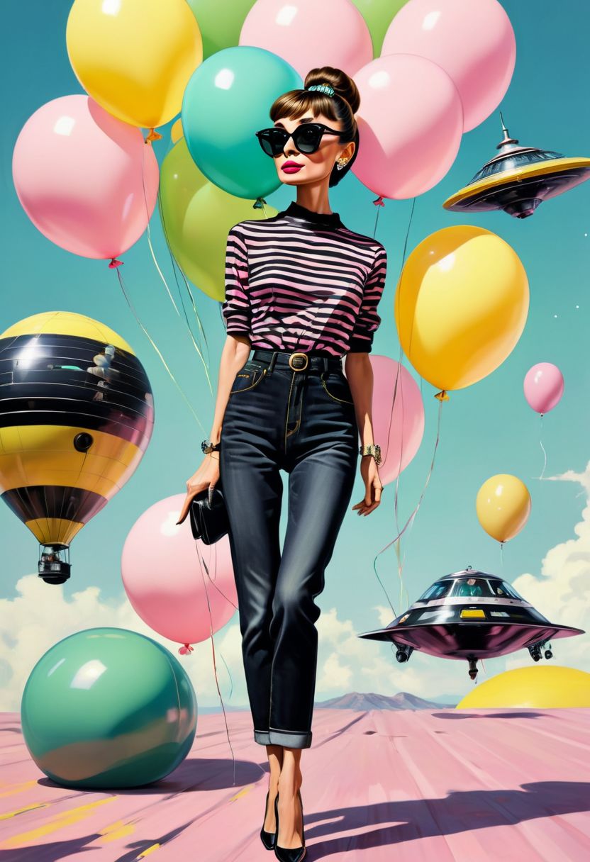 (Centrifuge dramatic brush strokes Cute colors Audrey Hepburn visuals:1.18), wearing black stripes shirt, long denim, donning sun glasses by CK, pale pink green and yellow, full body, colorful spaceships in blackground, curcle shape balloons,