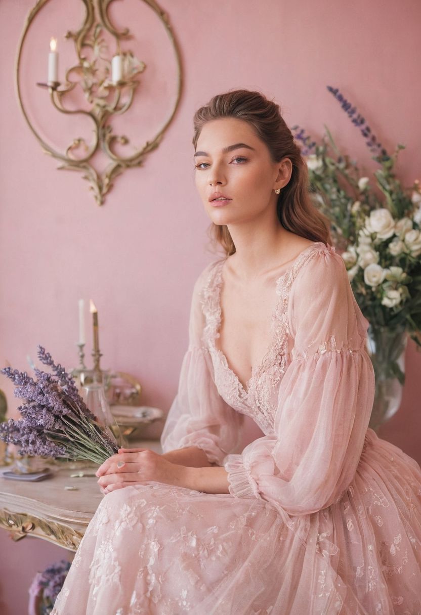 Imagine a whimsical photoshoot with a stunning model, showcasing her sexy and stylish outfits in a beautifully designed room with soft, pastel aesthetics, and a hint of pinkish tones. Captured with the Canon EOS R5 camera and the RF 50mm f/1.2L USM lens, this shoot exudes a romantic and dreamy atmosphere. The model, surrounded by pastel-hued walls, delicate furnishings, and soft lighting, becomes the embodiment of whimsical elegance. The wide aperture of the lens creates a shallow depth of field, blurring the background and adding a soft focus effect to enhance the overall dreamlike vibe. The pastel palette, with its soft pinks, lavenders, and creamy whites, complements the model's radiant beauty and the stylish outfits she dons. This shoot, with its subtle pinkish color grading and aesthetic appeal, captures the essence of fantasy and glamour, creating a unique and captivating series of portraits.
