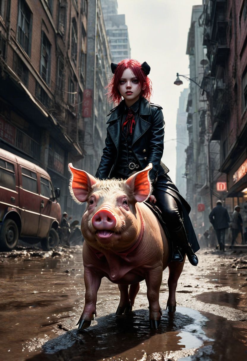 (( Photograph of (Evil and menacing but cute looking gothgirl, riding a large, muddy, duroc pig on a busy city sidewalk.) = (The evil and menacing but cute gothgirl is on the back of the duroc pig, this same menacing cute evil gothgirl is looking towards the viewer, the evil and menacing but cute gothgirl is making a circle or 'O' shape with her hand and sticking her tongue in the centre) + (the duroc pig is muddy, and bucking / the muddy duroc pig is jumping with an arched back) + (busy city sidewalk). )) BREAK ((Dark, melancholy, bleak, pyschologically unsettling, disturbing, upsetting, perfect quality, extremely detailed, intricately detailed background, cinematic, sepia with soft washes of maroon, midnight blue, and dark purple, splatters of red blood, perfect accuracy, award winning photograph)) BREAK ,((uhd, 8k photograph taken with Sony A7R III, 1/30sec at f/5.6, ISO 20,000, 12-24mm f/4 at 12mm, unusual low angles looking up, experimental lighting, evil shadowing)) BREAK ((inverted pentagram emblem present)), ng_deepnegative_v1_75t, epiCRealism, Ellis-RealismBoost