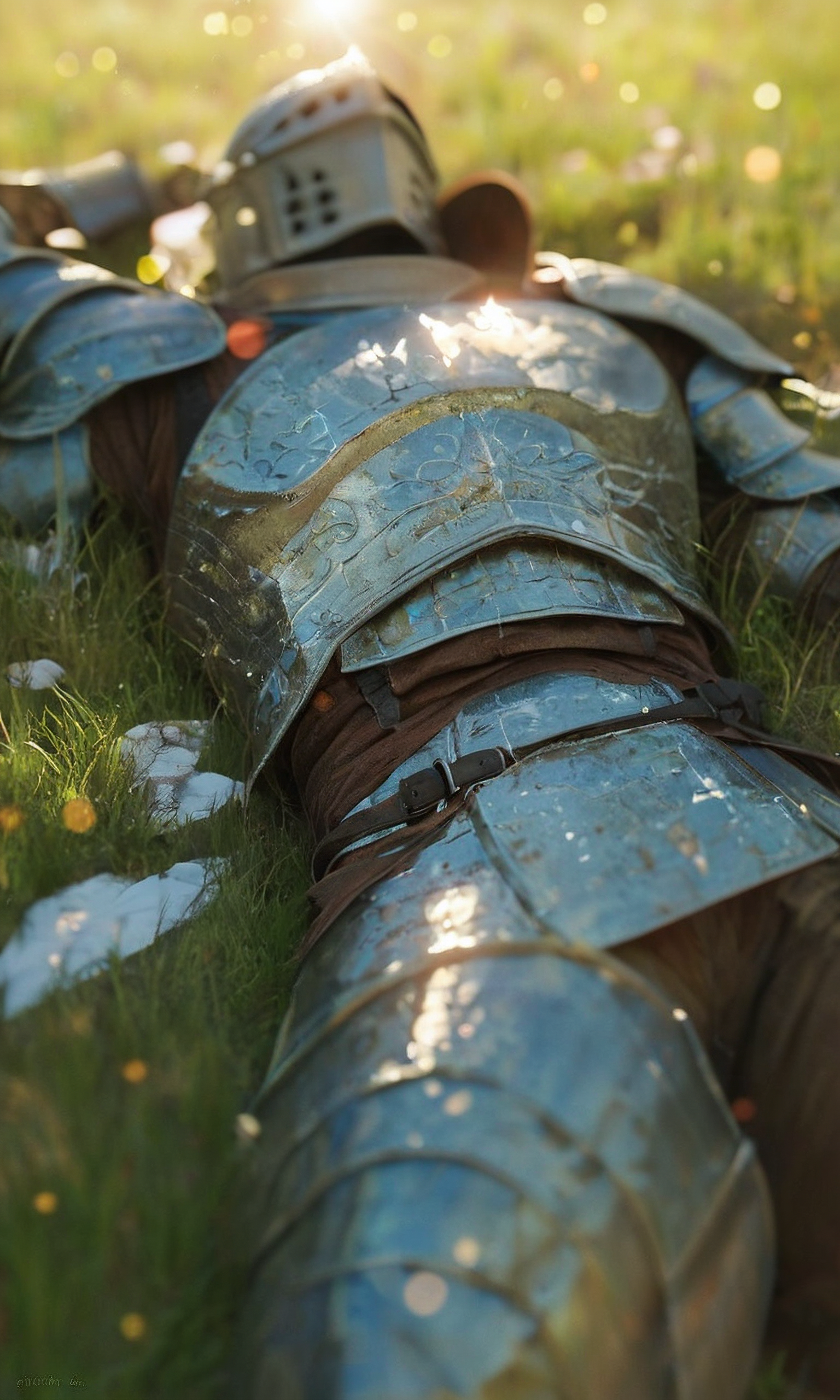 score_9, score_8_up, score_7_up, BREAK, knight, dark fantasy, epic armor, rust, laying back, helmet, lens flare, grass, sleeping, top view, dark souls, rim lighting, depth of field, <lora:RELSM_v1:.9>